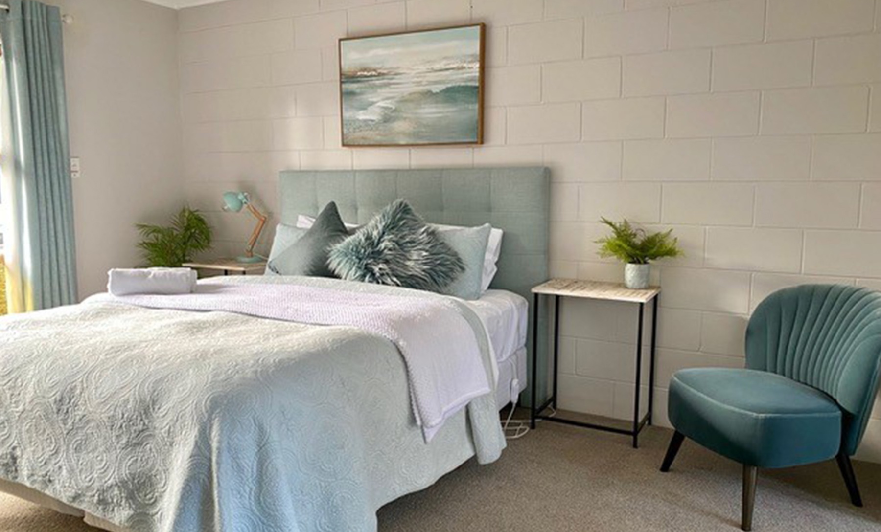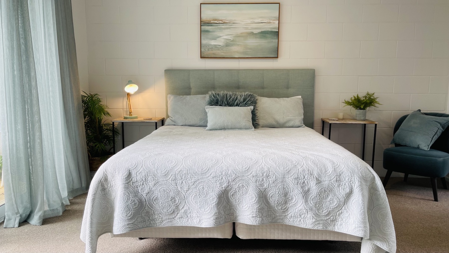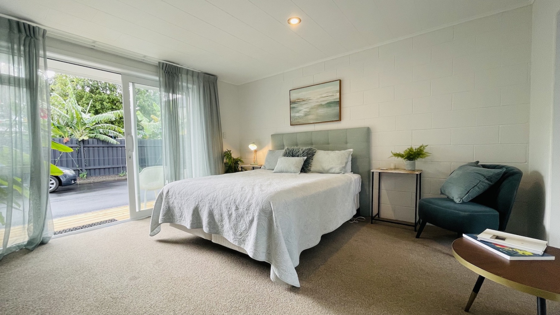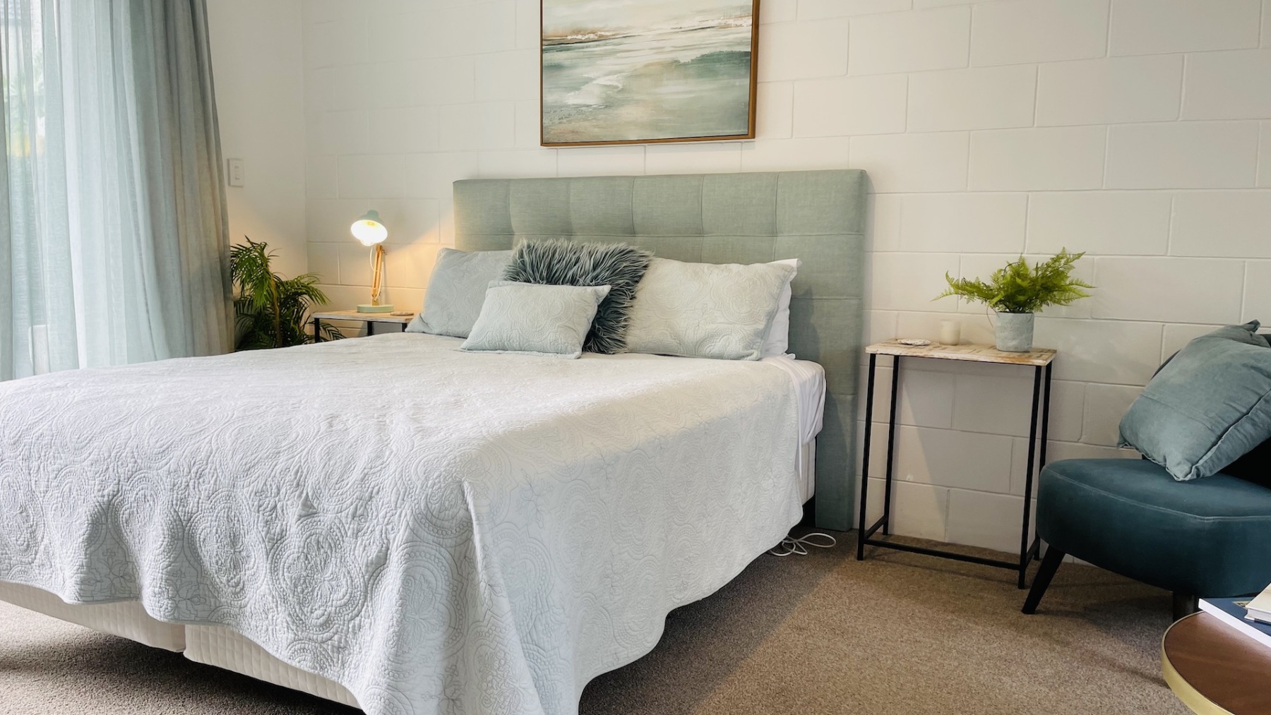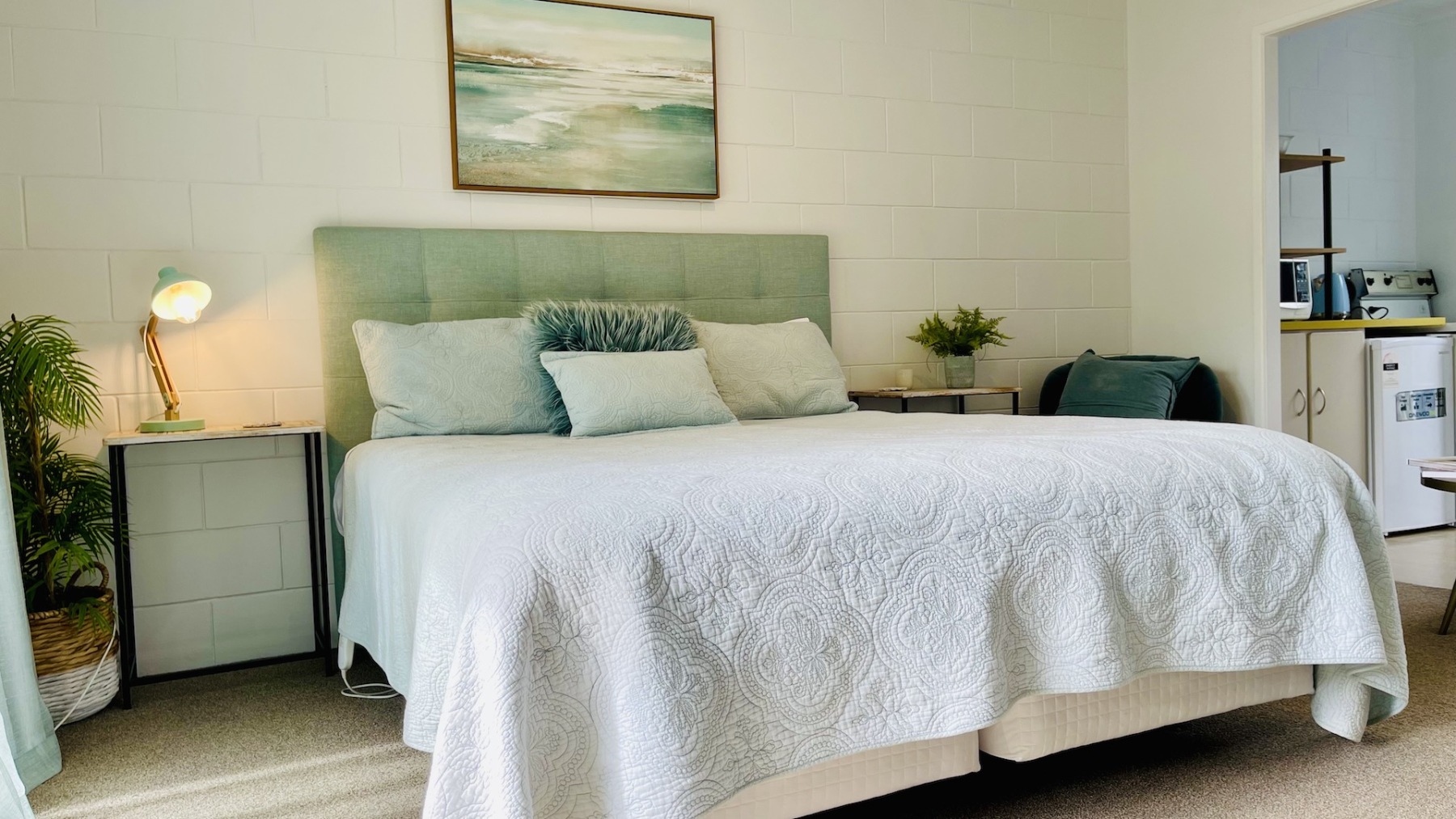Step into the spacious 30m² Oceans Suite, a coastal haven featuring a King bed and a single bed. Adorned in soothing turquoise hues, this room exudes romantic charm with soft sheer curtains and captivating artwork. Enjoy a kitchenette, ensuite bathroom, and a small deck opening onto a colurful garden and parking—a mere 10-second stroll to the waterfront pool and spa area along our tropical boardwalk. Parking adjacent to your room against the Jasmine wall makes access effortless.